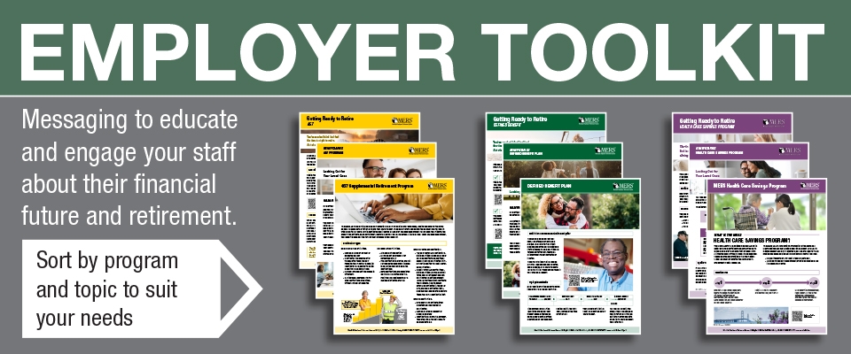 Disclaimer: The information contained in this Web site is being made available as a public service. The information is not intended to constitute legal, tax, accounting or investment advice, or to replace official versions of that information. Benefit Estimates or Service Credit Purchase estimates requested through this Web site are not official descriptions of any benefits, and do not represent a promise by MERS to provide any benefit(s) to any person(s). No one can detrimentally rely upon the information provided in, or requested through this Web site. MERS reserves the right to correct any errors, and presents this information without warranties, express or implied, regarding the information's accuracy, timeliness or completeness. If you believe the information is inaccurate, out-of-date, or incomplete, or if you have problems accessing or reading the information, please call MERS at 800.767.6377.